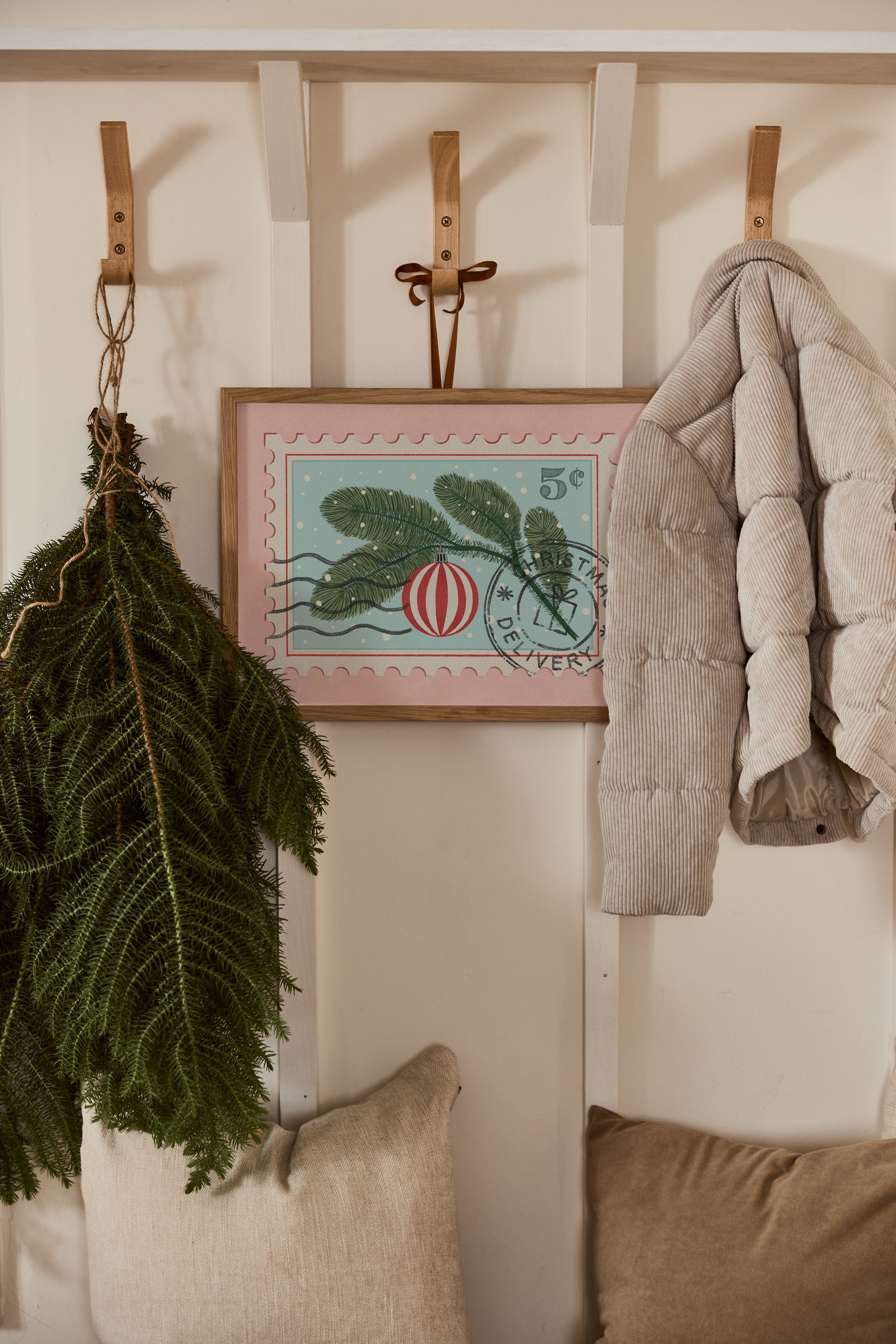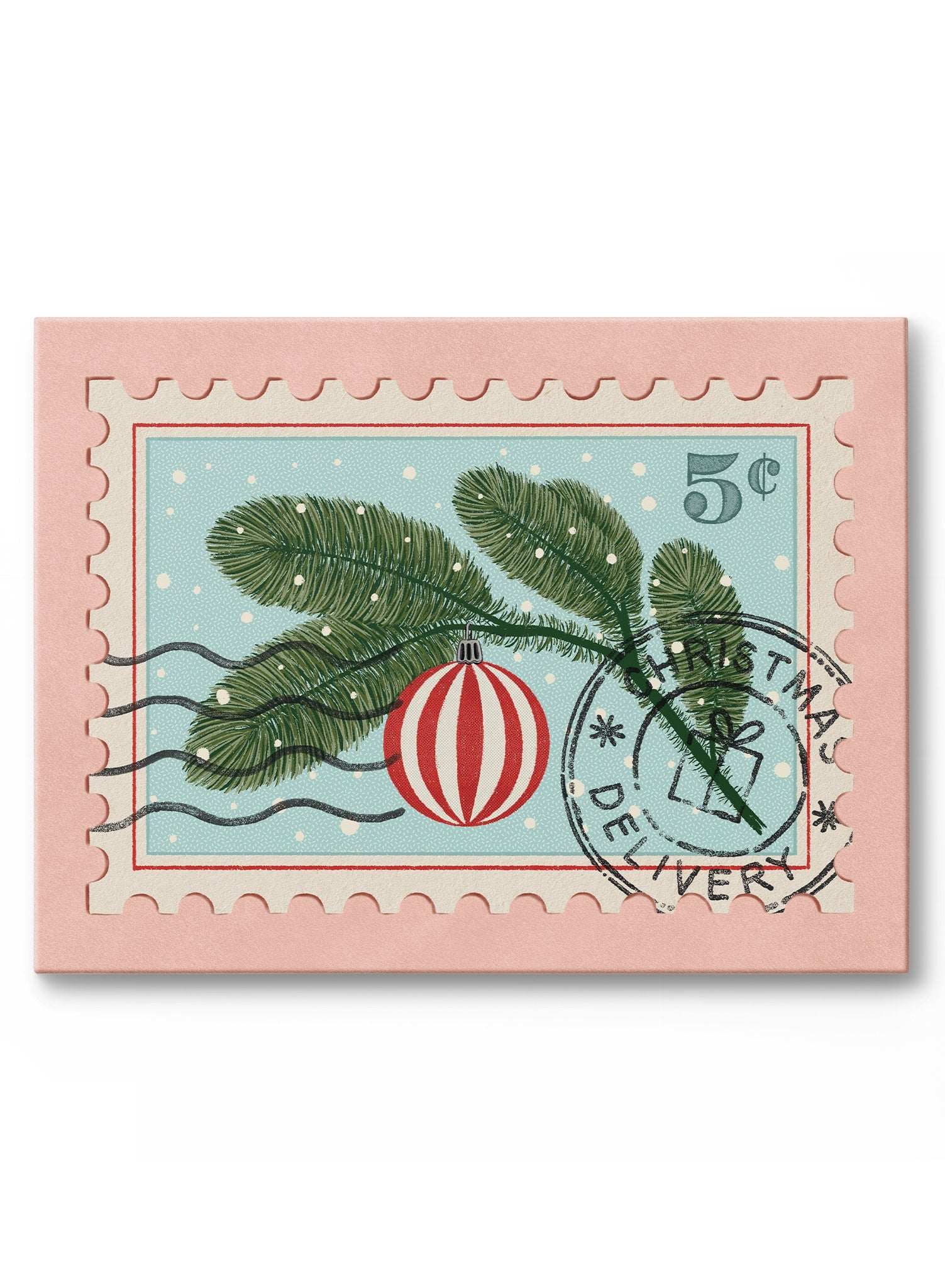 This artwork features a vintage-style postage stamp with a branch of a Christmas tree, adorned with a classic red ornament. The delicate needles of the branch are carefully detailed, while the bold red ornament adds a pop of color against the soft blue background. The stamp design, complete with a festive postmark, evokes memories of receiving holiday cards in the mail.