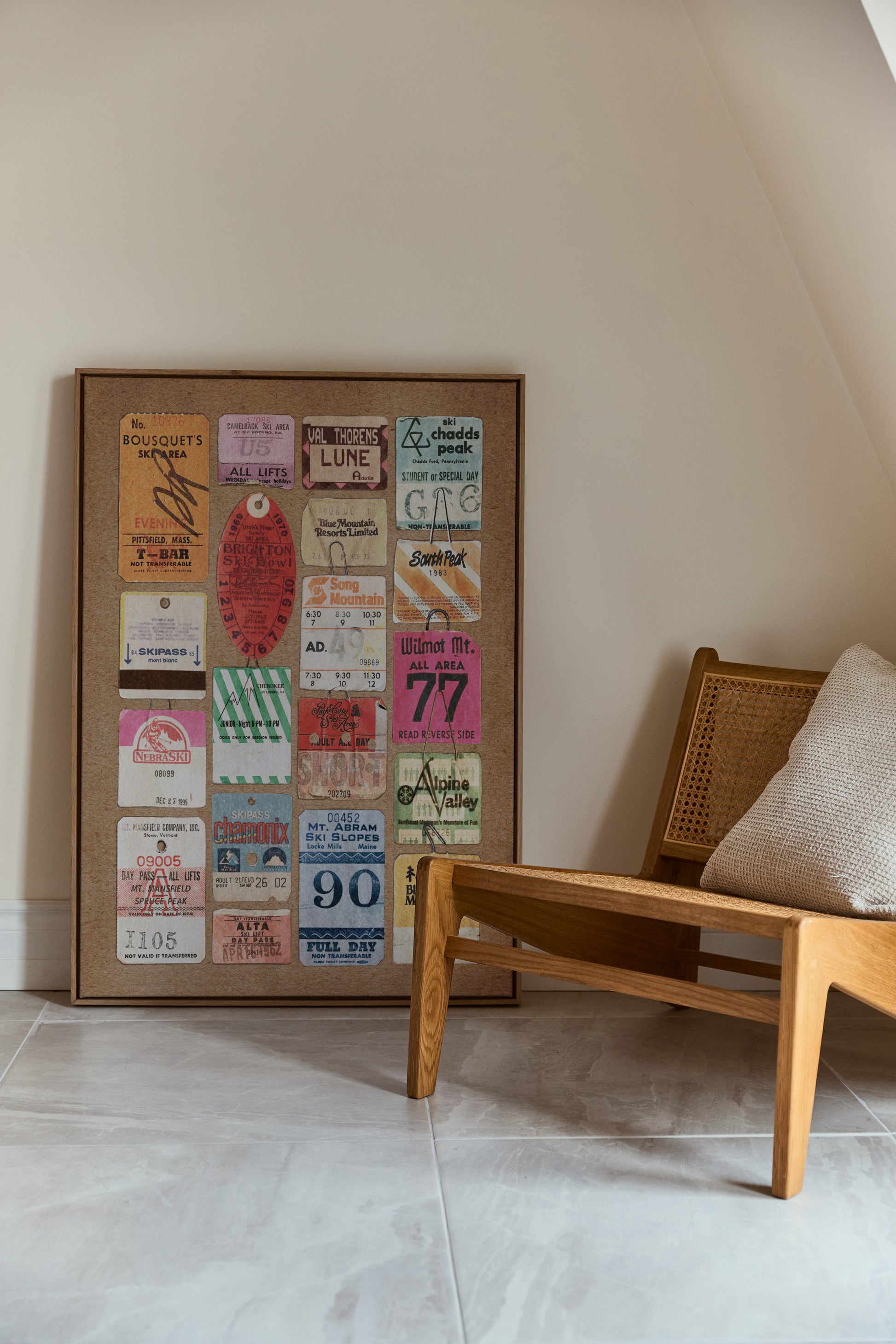 This artwork is a carefully curated collage of vintage ski passes, each with its own unique color scheme, typography, and design. The worn edges, faded colors, and creases in the paper lend a sense of nostalgia, as though these passes were collected over many years of ski trips and adventures. Each pass tells its own story, with dates, locations, and logos capturing the charm of different eras in skiing history.